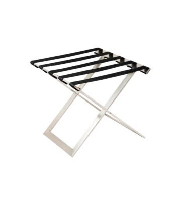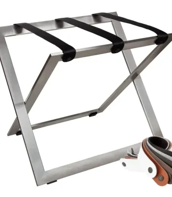 Porte-bagages en acier inoxydable brossé, compact et équipé de sangles échangeables, idéal pour un usage intensif et élégant.