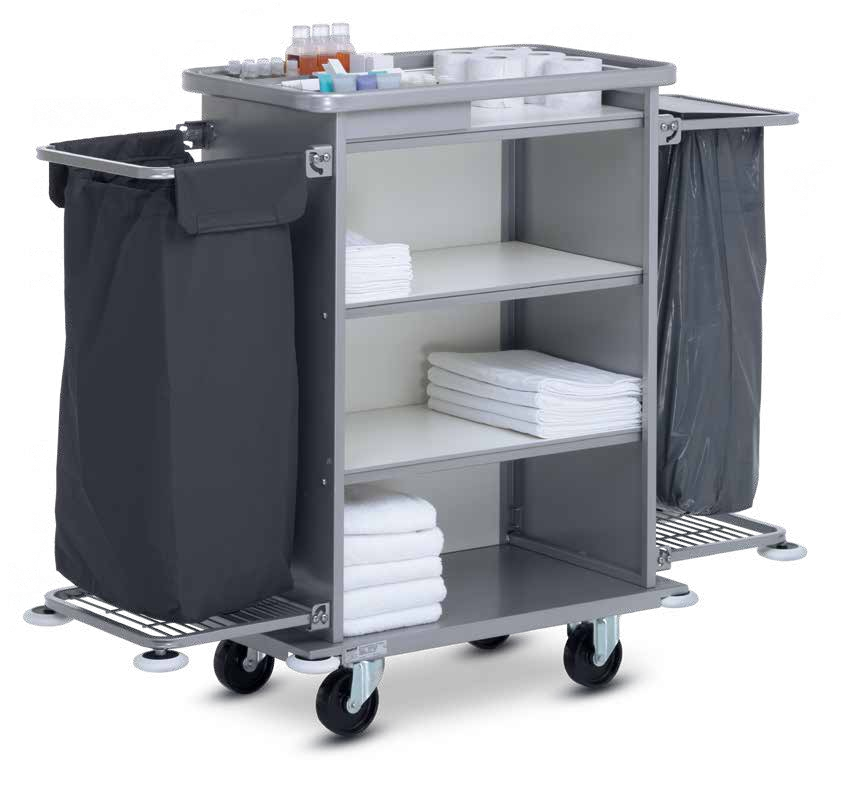 Le chariot de ménage Basic est une solution économique et efficace pour optimiser le service d’étage. Avec ses pare-chocs intégrés, ses bagues déflectrices pour protéger le mobilier et son design blanc platine, il allie fonctionnalité et esthétique. Idéal pour les hôtels soucieux de leur budget sans compromettre la qualité.