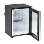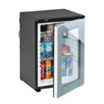 Minibar à compression de 35 litres, porte vitrée réversible et élégante. Compact, silencieux, et économique avec une consommation réduite de 77 %. Idéal pour hôtels et chambres d’hôtes.