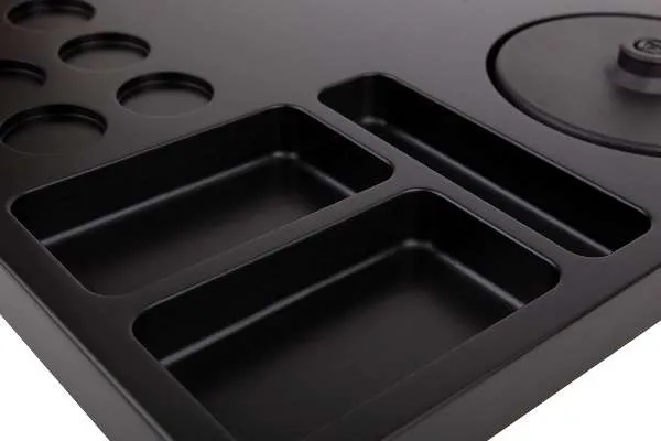 Fabriqué en MDF de haute qualité avec une finition noire mate, il est recouvert de 3 à 4 couches de vernis pour une durabilité optimale et une apparence sophistiquée. Ce plateau offre des compartiments astucieusement conçus pour organiser sachets de thé, capsules de café, sucre et lait, tout en accueillant une machine à café ou une bouilloire.