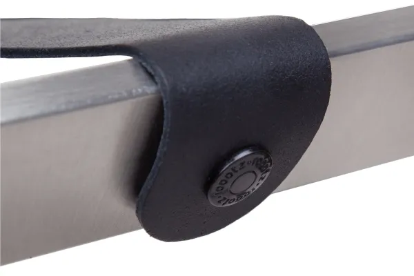 Porte-bagages en acier inoxydable brossé, compact et équipé de sangles échangeables, idéal pour un usage intensif et élégant.