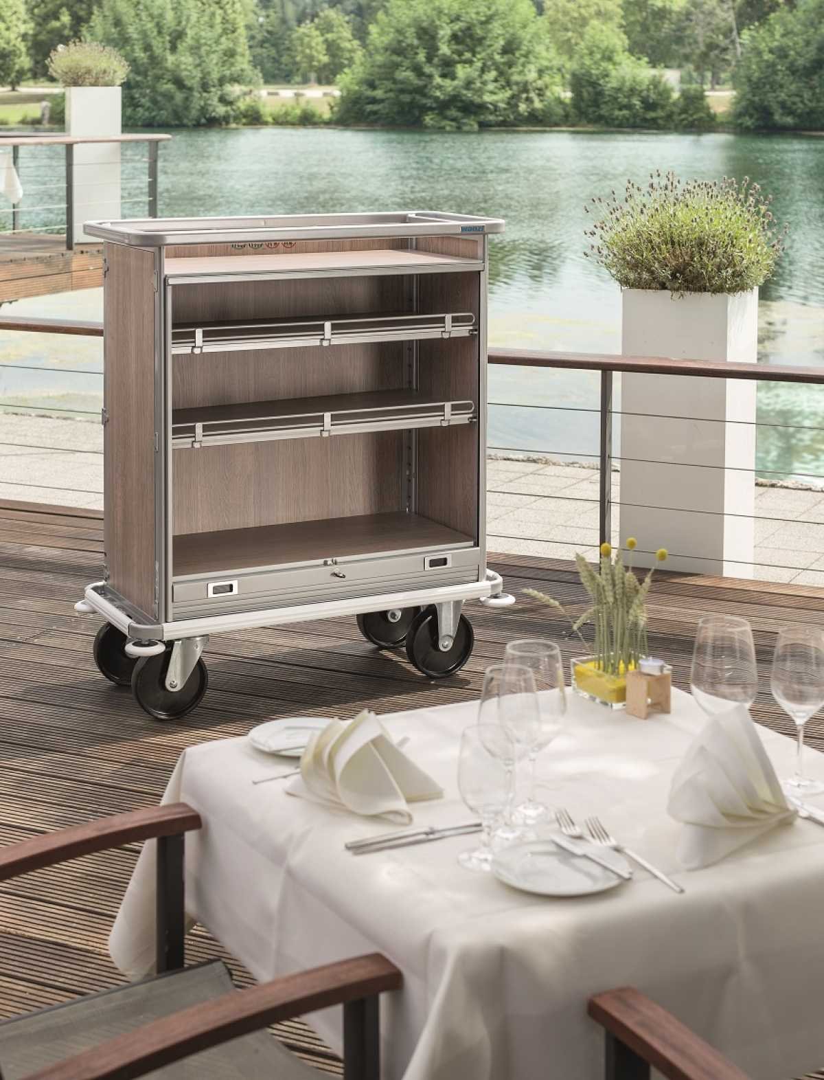 Le chariot WANZL MBW-Smart est conçu pour un service minibar efficace et organisé. Doté de 2 étagères réglables avec barres de retenue et d’un panneau roulant verrouillable, il protège le contenu tout en facilitant le transport dans les espaces étroits.